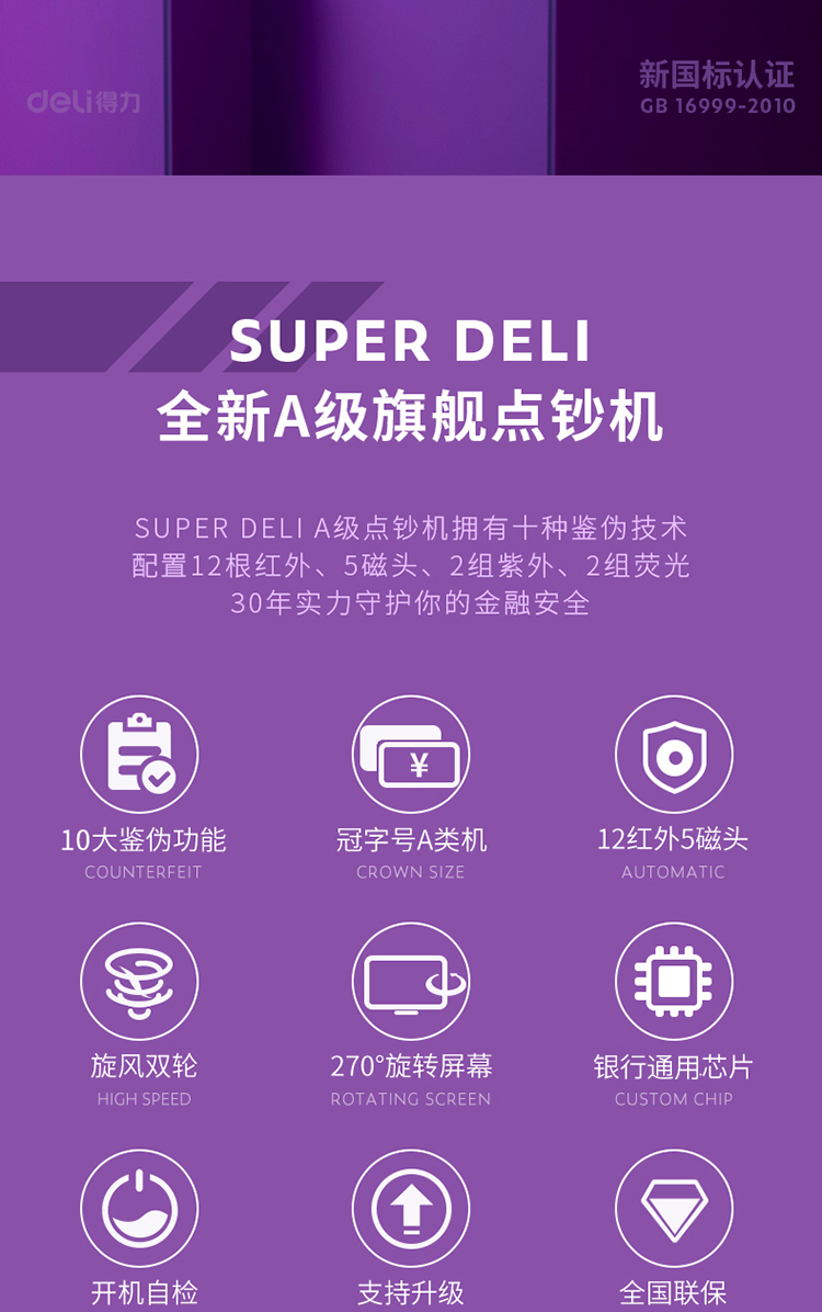 得力(deli)A類銀行專用多功能智能點鈔機 驗鈔機 10重鑒偽人民幣驗鈔機 2126