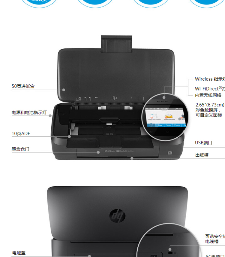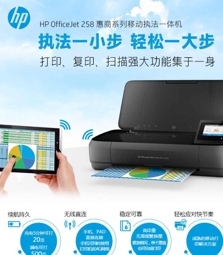 惠普(HP)OfficeJet 258 A4 彩色單功能移動便攜式打印一體機 無線打印